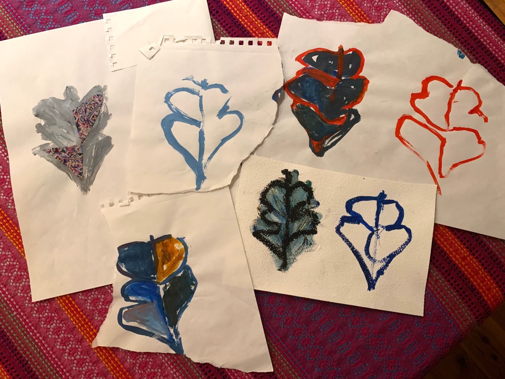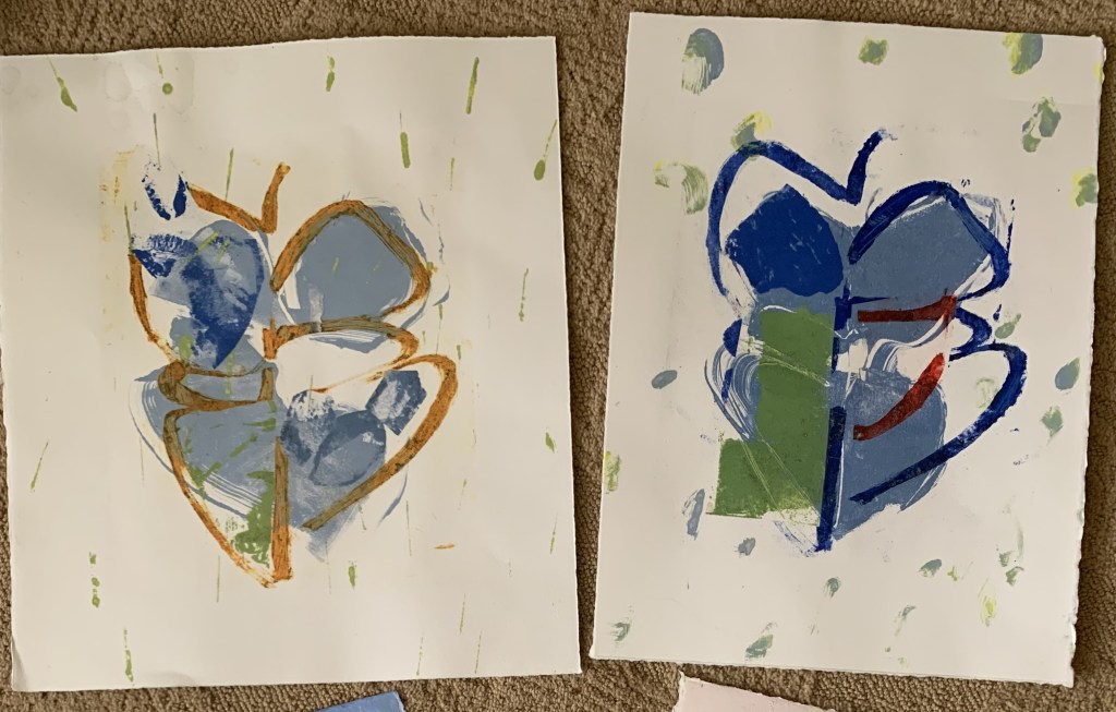 I used that shape when taking a printmaking workshop. What I learned from the workshop studies below is how I loved playing with the flower-like shape along with making other marks on the plate. I wanted to explore this approach further into creating finished pieces.